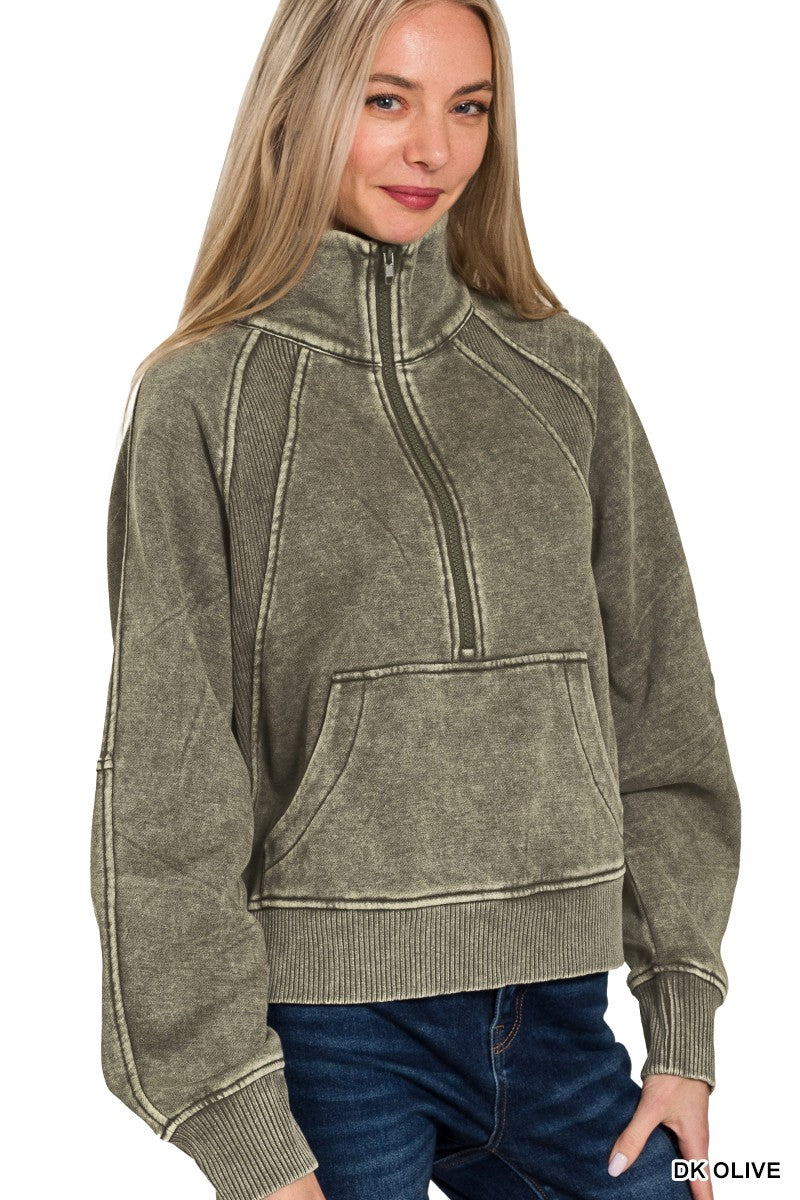 ACID WASHED HALF ZIP FLEECE PULLOVER KANGAROO pocket
